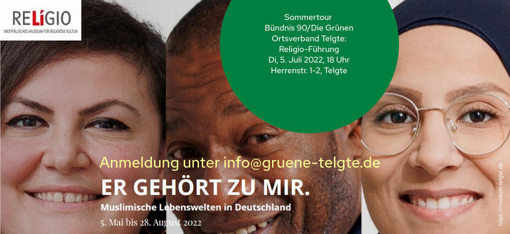 Im Rahmen unserer Sommertour 2022 laden wir Euch am Dienstag, den 5. Juli, um 18 Uhr zu einem gemeinsamen Besuch ins Religio ein. Im Religio gibt es aktuell eine Sonderausstellung mit dem Titel „Er gehört zu mir“. Sie befasst sich mit muslimischen Lebenswelten in Deutschland und zeigt diese anhand von zwölf Lebenswegen muslimischer Menschen unterschiedlicher Herkunft und Prägung. Museumsleiterin Dr. Anja Schöne, @museum_religio, wird uns durch die Ausstellung führen.