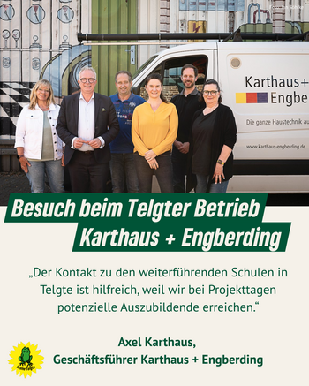 Das Handwerk ist wichtiger Motor für Wachstum und Wohlstand – auch in Telgte. Unternehmen wie die Firma Karthaus & Engberding als Innungsbetrieb für Elektro sowie Sanitär und Heizung leisten vor Ort auch einen wichtigen Beitrag zur Wärmewende. Gemeinsam mit Frank Tischner, Hauptgeschäftsführer der Kreishandwerkerschaft Steinfurt-Warendorf, haben wir Telgter Grünen die Geschäftsführer Axel Karthaus und Thomas Probst besucht, zugehört und Ideen diskutiert.