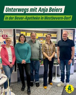 Immer mehr Apotheken in Deutschland schließen, obwohl sie gerade auf dem Land wichtige Versorgungseinrichtungen sind. In Westbevern hat die Nachfolge dem Trend entgegen funktioniert. Mit Sandra Drepper und ihrem Mann Volker hat die Bever-Apotheke neue Eigentümer gefunden, die seit etwas mehr als einem Jahr die Medikamentenversorgung im Dorf übernommen haben. „Onlinebestellungen sind längst kein Ersatz für den Service der Mitarbeitenden in Hausapotheken, die den Menschen und seine Krankheiten in Gänze kennen, mit Kundenkarten den Überblick behalten und entsprechend beraten. Die Finanzierung der Apotheken müssen wir im Hinblick auf die Sicherstellung einer guten, flächendeckenden und effizienten Versorgung reformieren“, betonte Anja Beiers, Grüne Direktkandidatin für den Kreis Warendorf und gelernte pharmazeutisch-technische Assistenten (PTA). Gemeinsam mit unserer Bürgermeisterkandidatin Katja Behrendt und Christoph Grünewald aus dem Ortsverband Telgte besuchte sie die Apotheke in Westbevern. Die neue Eigentümerin freute sich über das Interesse der Politik, sich mit der Situation von Landapotheken auseinanderzusetzen.