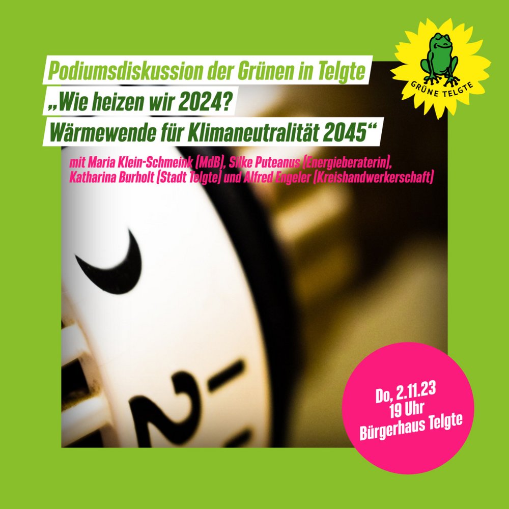 Eingeladen sind die Bundestagsabgeordnete und stellvertretende Vorsitzende der Grünen-Bundestagsfraktion, Maria Klein-Schmeink (Münster), Energieberaterin und Expertin der Verbraucherzentrale, Silke Puteanus (Münster), Alfred Engeler von der Kreishandwerkerschaft Steinfurt Warendorf und die Klimaschutzmanagerin der Stadt Telgte, Katharina Burholt.