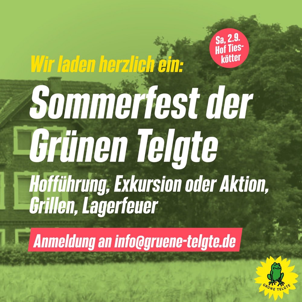 Das Sommerfest der Grünen in Telgte wird am Samstag, 2. September 2023, ab 15 Uhr 30 auf dem Hof Tieskötter, Harkampsheide 14, Telgte stattfinden.