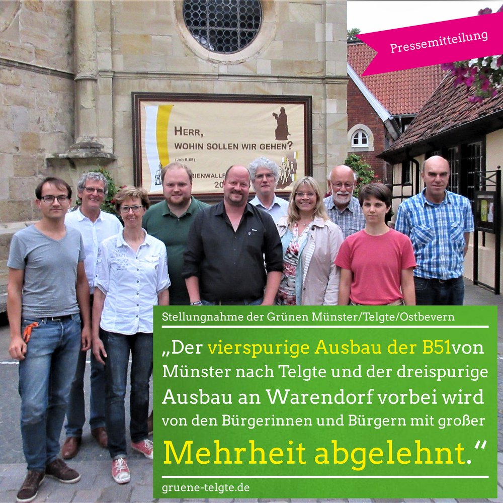 „Der vierspurige Ausbau der B51 von Münster nach Telgte und der dreispurige Ausbau an Warendorf vorbei wird von den Bürgerinnen und Bürgern mit großer Mehrheit abgelehnt.“ Dieses Fazit zogen die Vorstände und Fraktionen der Grünen aus Münster, Telgte und Ostbevern nach der Informationsveranstaltung zur B51 am Mittwochabend in Telgte.