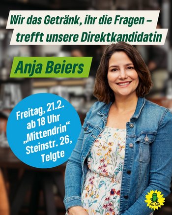 Die Wahl steht vor der Tür! 🚪💚 Du hast noch Fragen an unsere Grüne Direktkandidatin Anja Beiers? Oder möchtest sie einfach in entspannter Atmosphäre kennenlernen? Dann komm vorbei!
